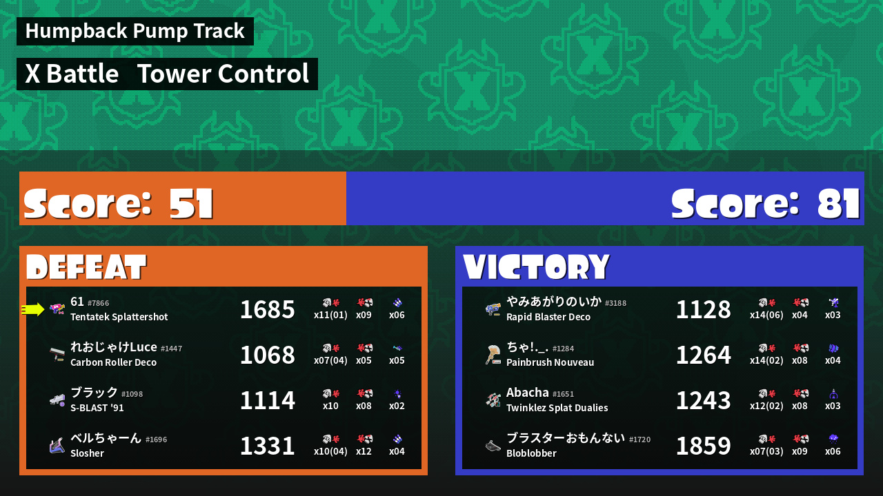 | Weapon | Tentatek Splattershot ( Splat Bomb / Triple Inkstrike) | ||