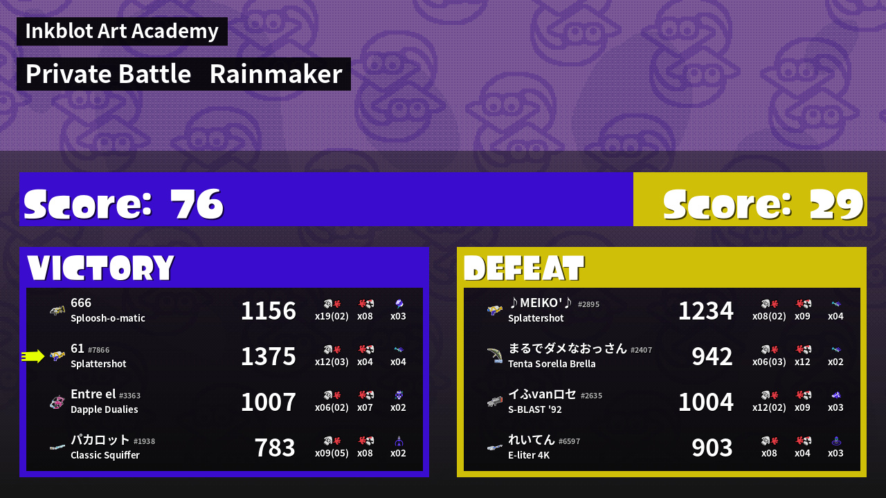 | Weapon | Splattershot ( Suction Bomb / Trizooka) | ||