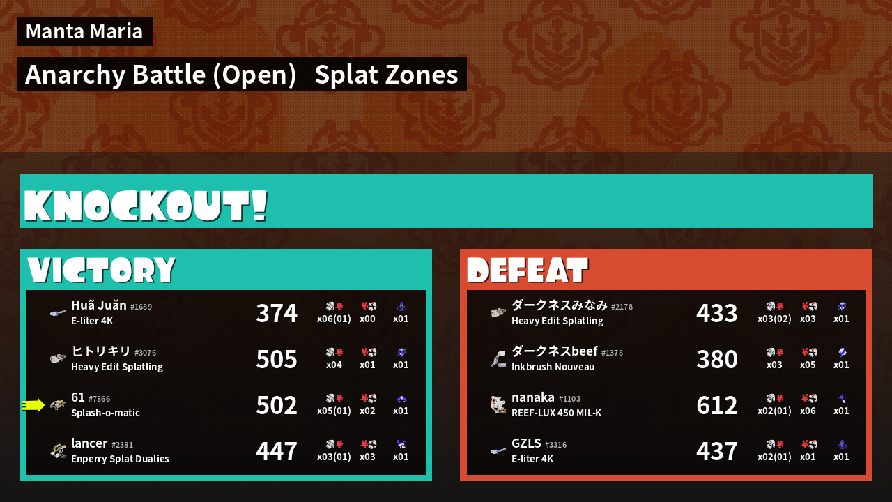 | Mode | Splat Zones - Anarchy Battle (Open) | ||