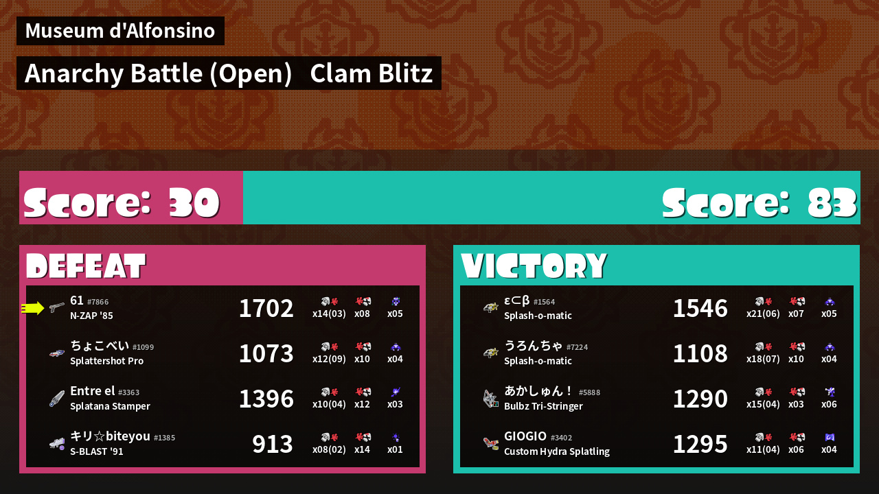 | Medals |  #1 Overall Splatter  #1 Score Booster  #1 Clam Carrier | ||
