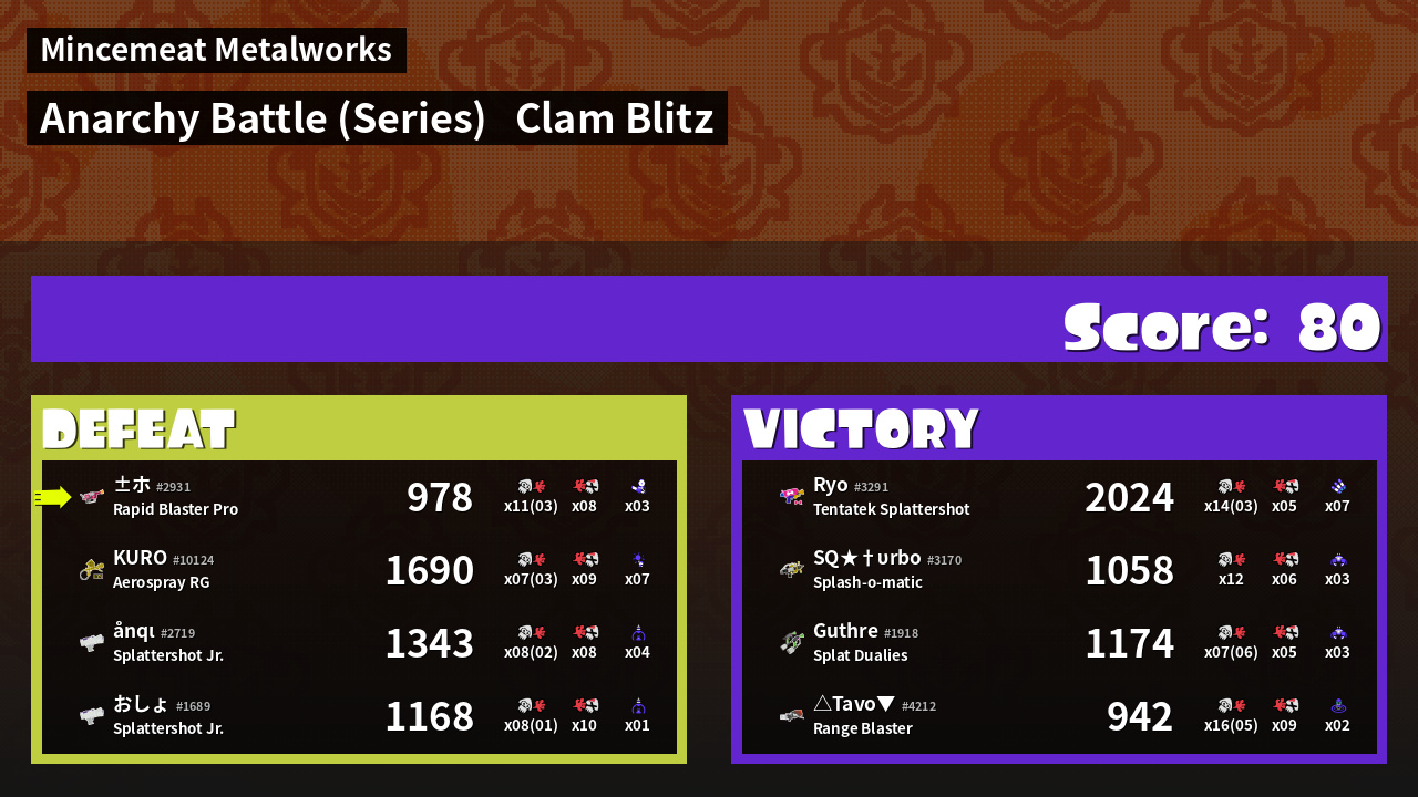 | Medals | #1 Overall Splatter #1 Clam Carrier #1 Popular Target | ||